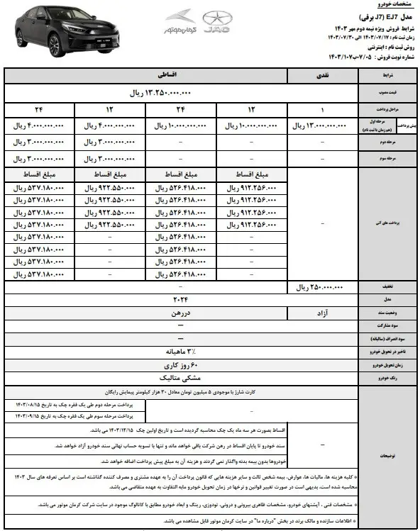شرکت کرمان موتور شرایط فروش اقساطی خودروی برقی کی ام سی EJ۷ را اعلام کرد. در این طرح، جک J۷ برقی به صورت نقدی یک مرحله ای و یا اقساطی ۱۲ و ۲۴ ماهه به فروش می رسد.
