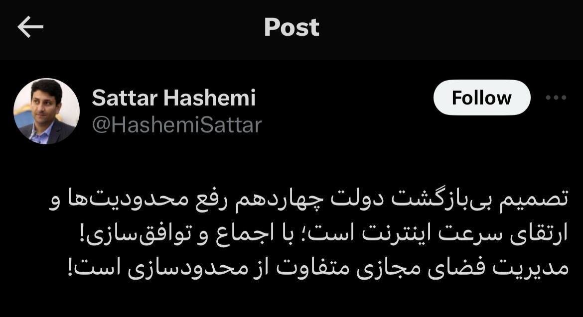 ستار هاشمی طی پستی در فضای مجازی نوشت: تصمیم بیبازگشت دولت چهاردهم رفع محدودیتها و ارتقای سرعت اینترنت است؛ با اجماع و توافقسازی!